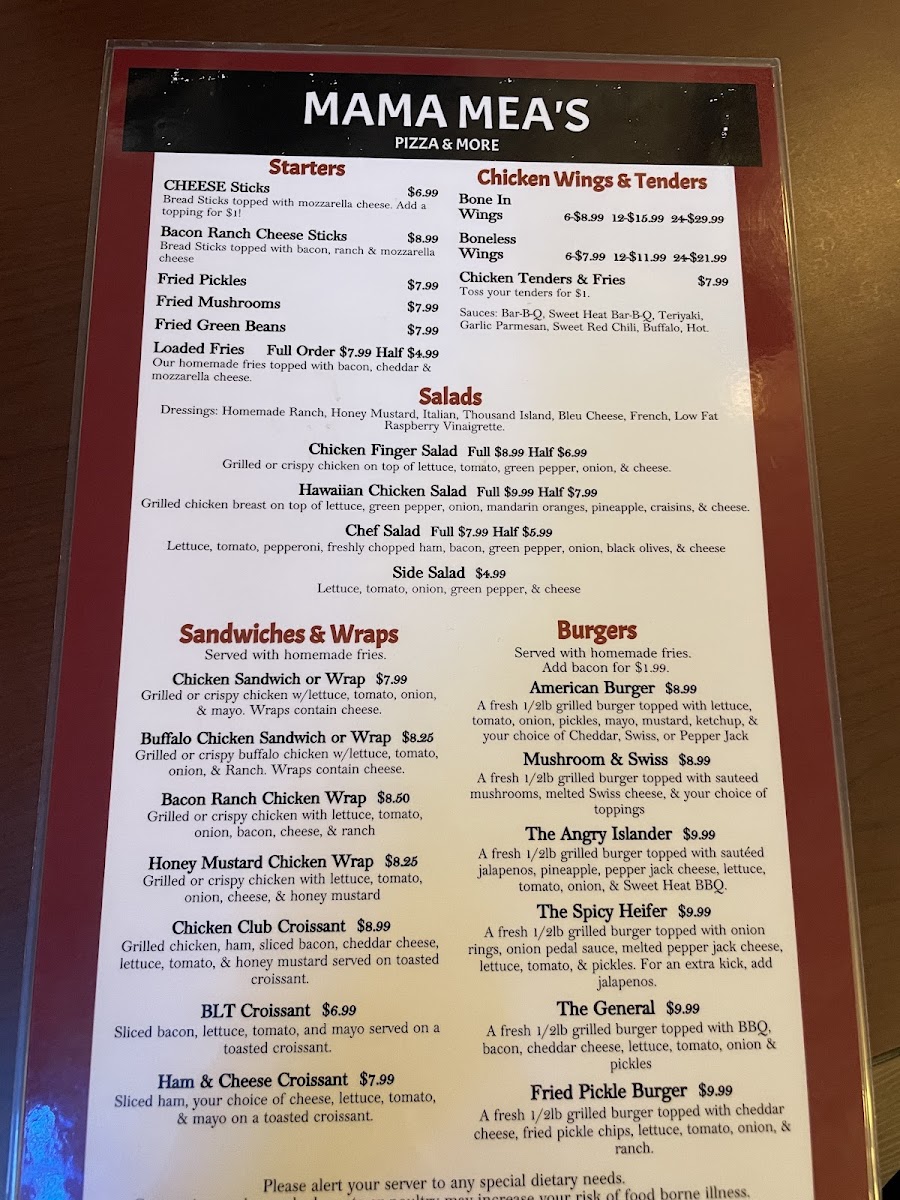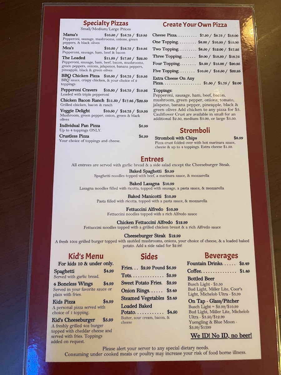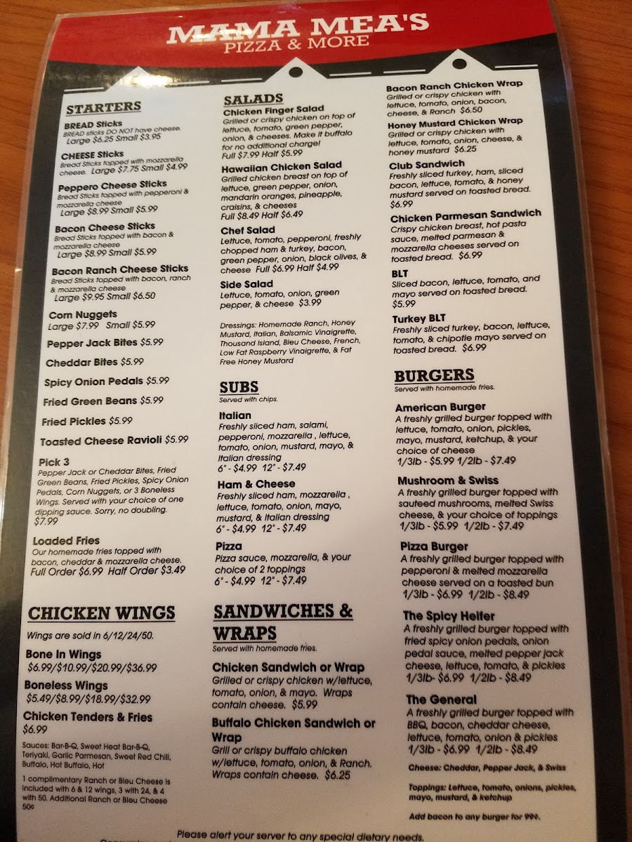 Mama Mea's Pizza & More offers a straightforward and inviting menu rooted in classic Italian and American comfort foods. You’ll find a variety of satisfying options suited for casual meals with family or friends, whether it's a relaxed lunch or a laid-back dinner. The menu includes favorites like hearty pizzas—such as Bar-B-Que Chicken Pizza or a Meat Lovers Pizza—as well as pastas like Chicken Fettuccine Alfredo and Baked Manicotti.